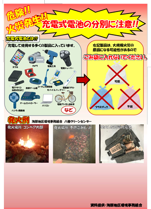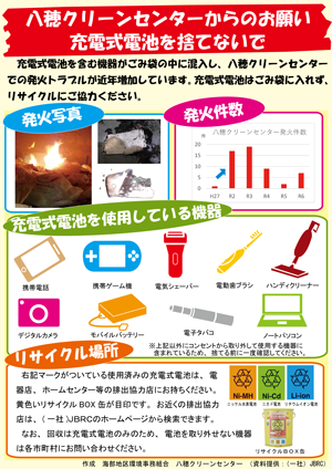 モバイルバッテリーや電子タバコなどの充電式電池が含まれている機器がごみ袋の中に混入し、八穂クリーンセンターで発火するトラブルが増加しています。